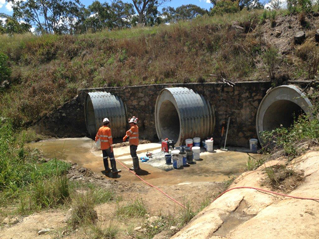 As part of flood repairs to New England Highway just outside of Stanthorpe, new culverts were constructed as part of the road upgrade for improved flood prevention. Test results on the 50 MPa concrete failed to meet with compressive strength tolerances of Transport and Main Roads specification. Xypex Concentrate, Xypex Modified and Xypex Gamma Cure were selected to rehabilitate the concrete to increase durability and improve the compressive strength. Raw Worx Pty Ltd were contracted to carry out the surface preparation and application of material to approximately 600 m² of concrete surface.